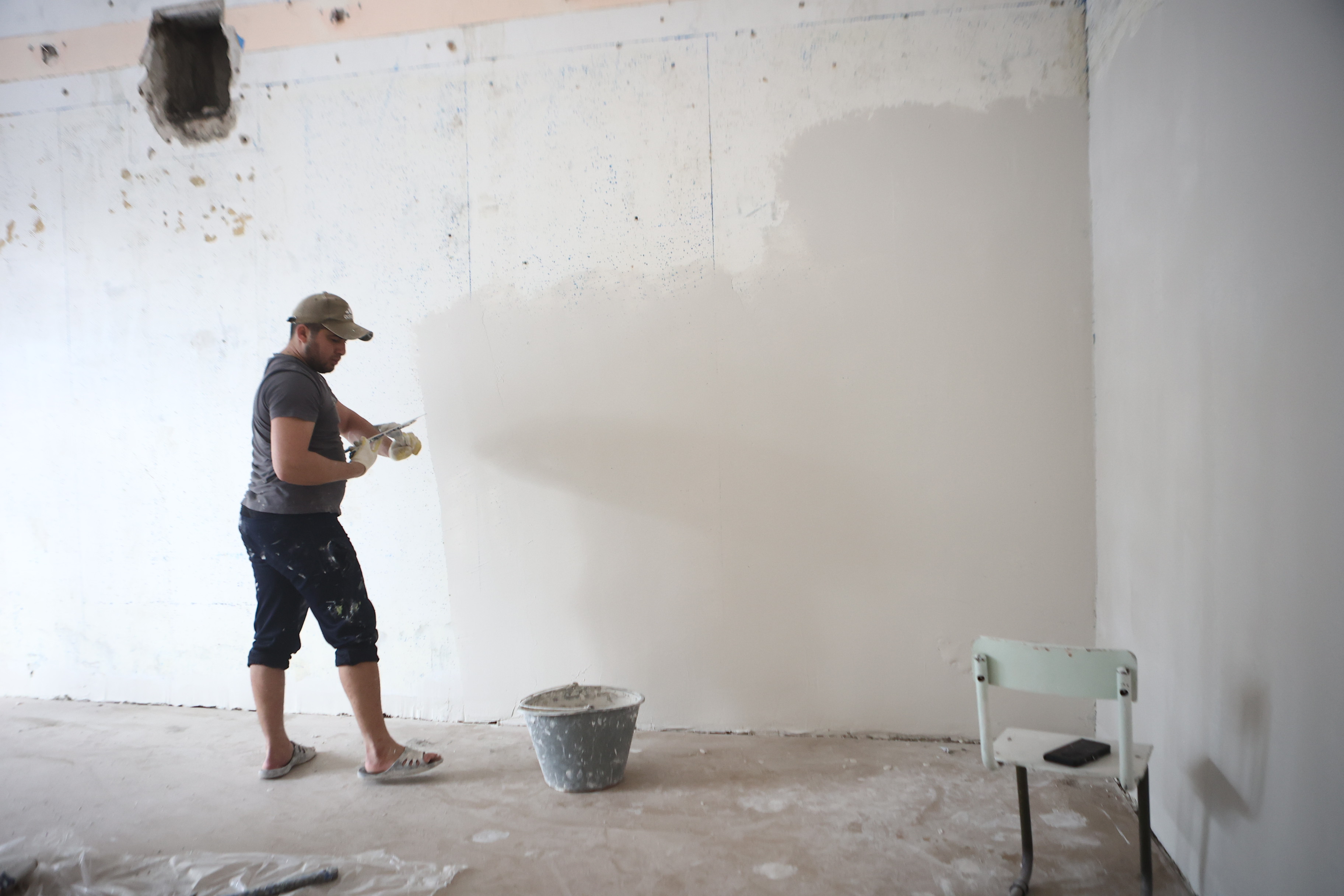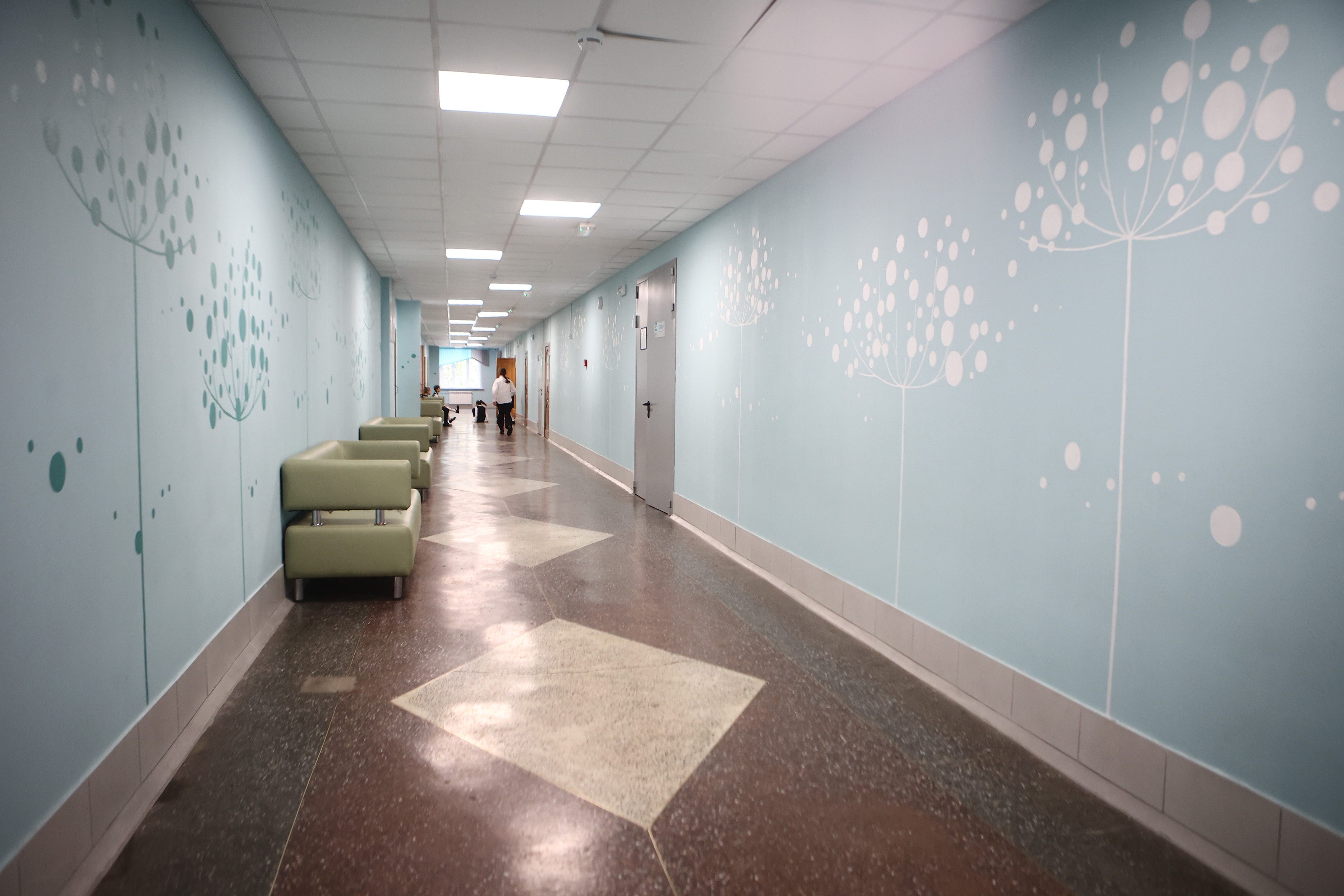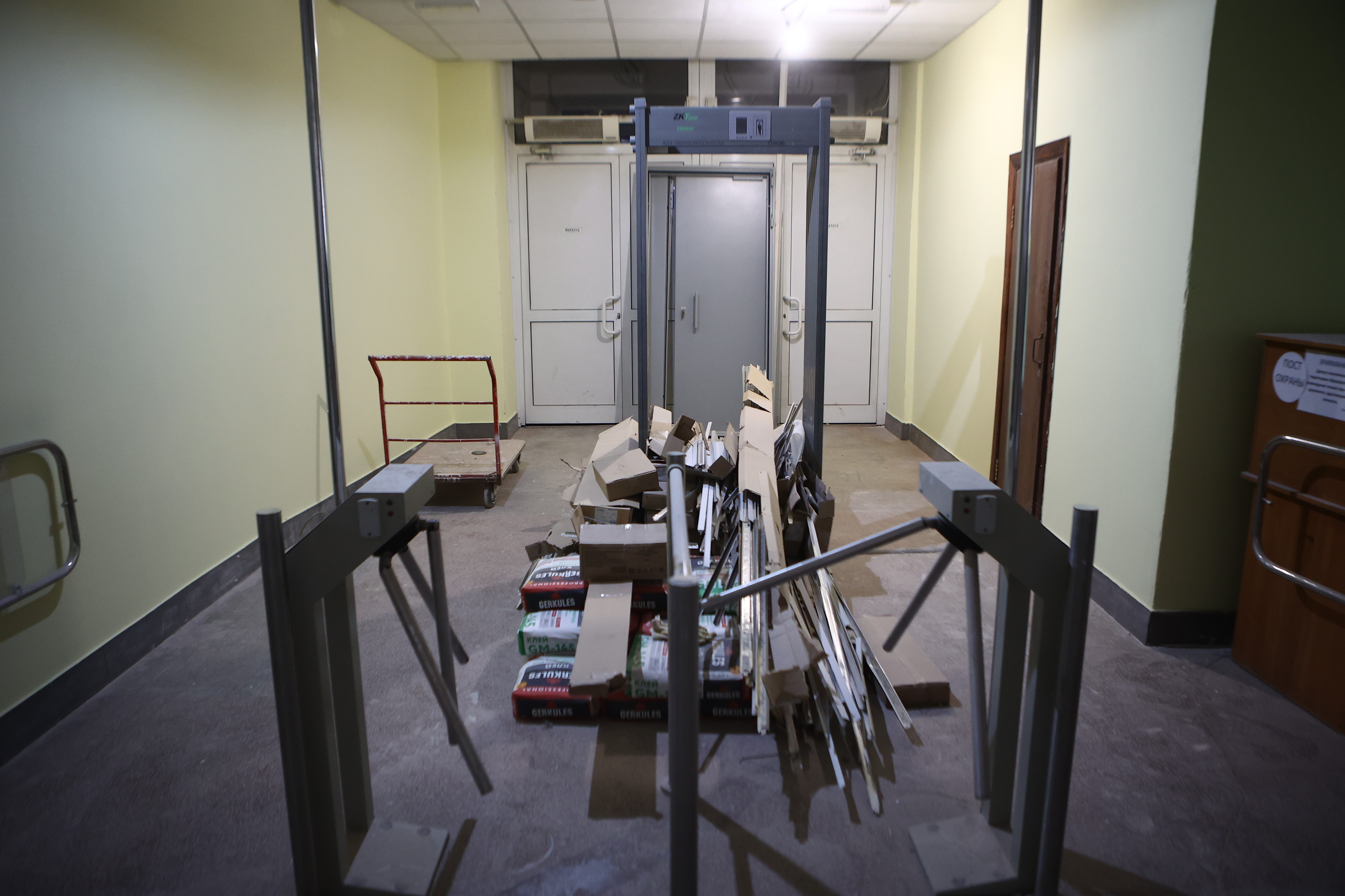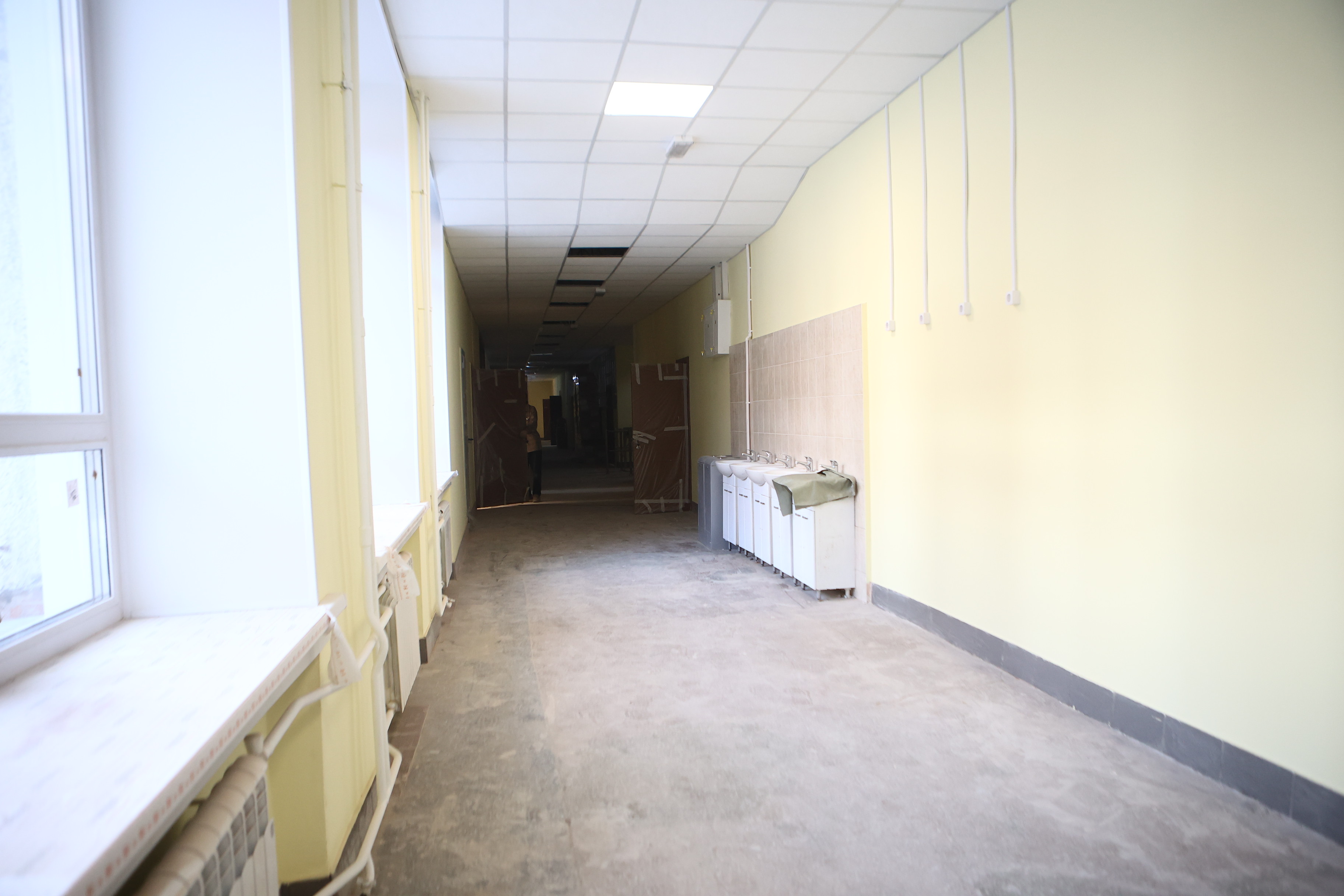 Сейчас заканчивают отделку и электромонтажную часть на первом этаже и в актовом зале.
