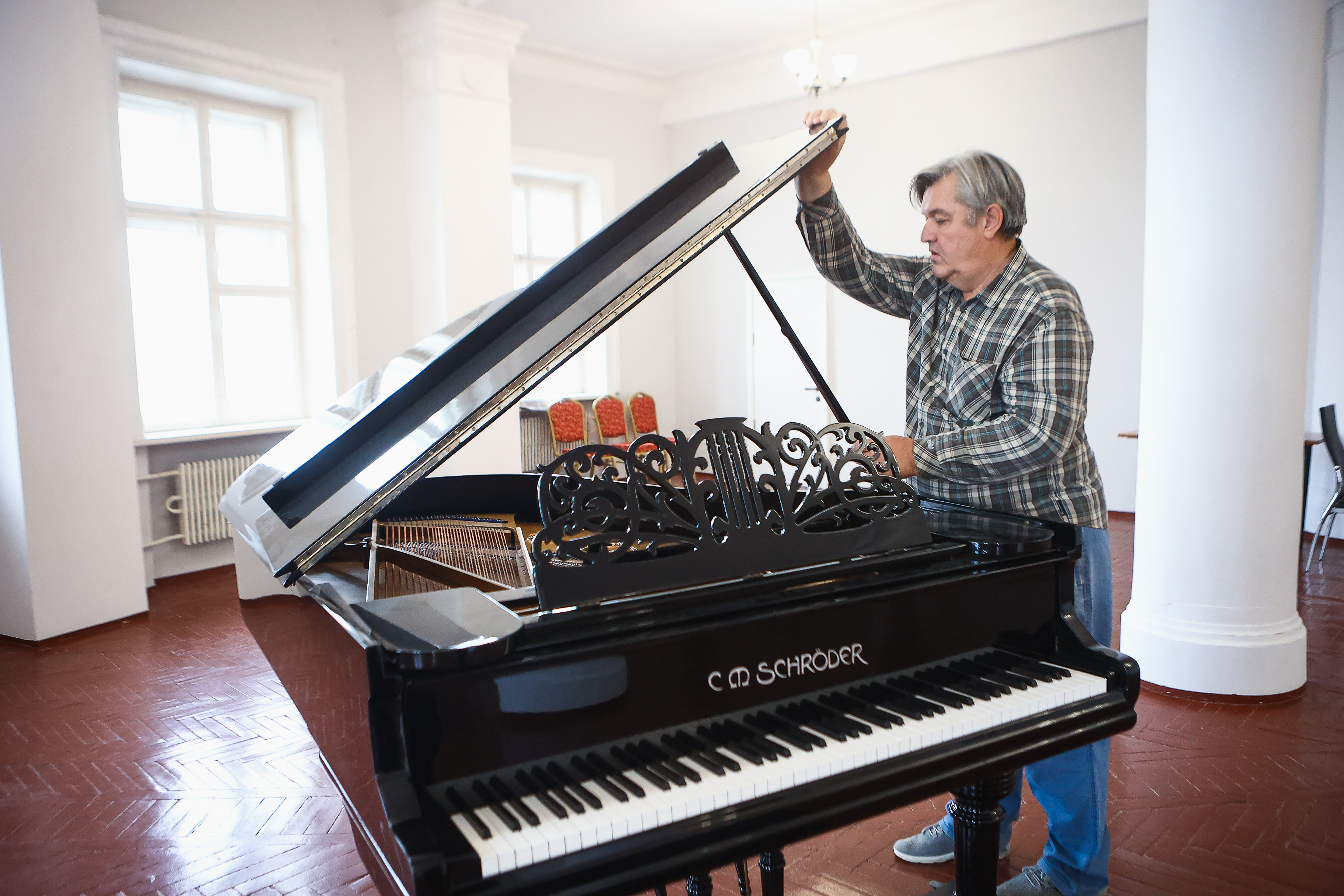 «Рояль, который находится в малом концертном зале, в своё время победил на выставке в Нью-Йорке. Сейчас инструмент носит имя мастера, который его реставрировал более трёх лет. Это Владимир Бирюков. Ему 86 лет, и он по-прежнему работает. Именно он начинал нашу мастерскую по ремонту роялей, единственную за Уралом. Инструмент уникальный, звук у него удивительный», — констатирует Владимир Август.