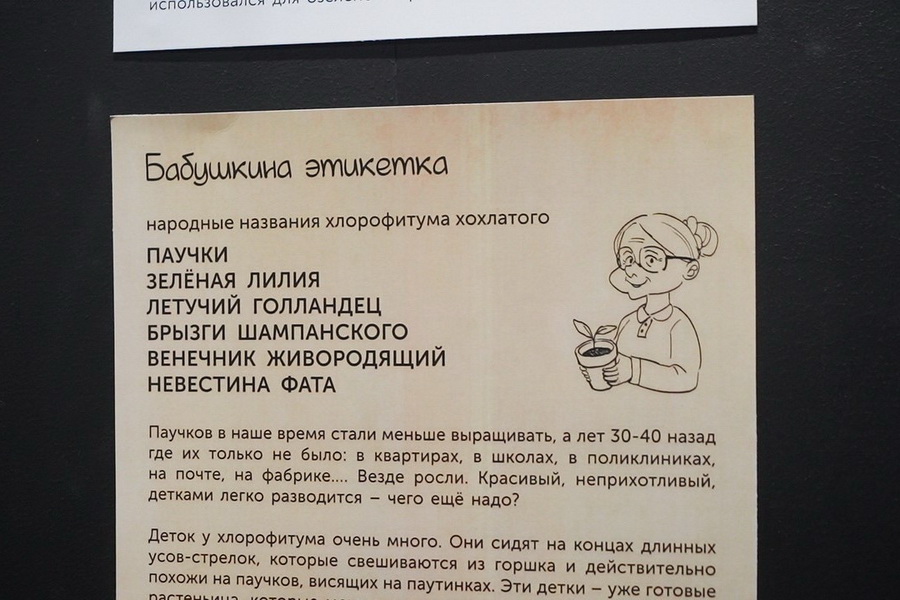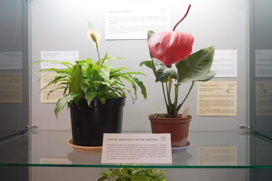 Каждый экспонат снабдили табличками с двумя наименованиями: научным, на латыни, и народным — «бабушкиным». Например, спатифиллум Уоллиса называли «женским счастьем», а антуриум Шерцера — «мужским». Считалось, что в паре они привносят идиллию в семейные отношения.