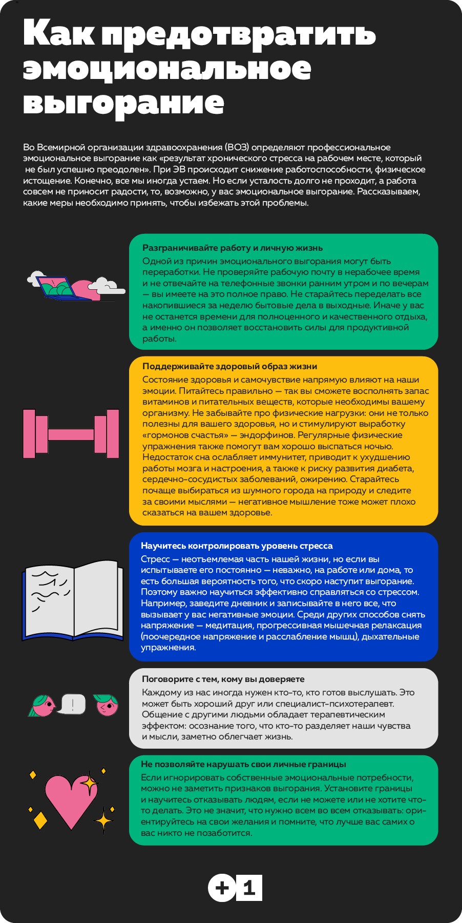 Казалось бы, всё просто: не перерабатывай, не стрессуй, питайся правильно — и будет тебе счастье. Но всё не так-то просто. Есть ещё один секретный компонент. Это общение, доверительные отношения с людьми. Если у вас есть с кем поговорить на самые разные темы — важные философские или просто посплетничать, это огромный шаг от эмоциональной усталости и выгорания. Когда среди близких людей нет такого человека, то можно и даже нужно обратиться за помощью к психологу или психотерапевту.
